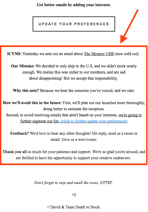 Check out the example below from the folks over at Death to Stock Photos. The point of the email is to apologize for an email they’d sent the previous day, which promoted a product that sold out way too quickly, didn’t ship internationally, and generally gave a lot of their customers a poor experience.