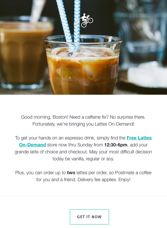 Postmates doesn’t wait to get to the point. After a brief, friendly hello, they get right down to the purpose of the email: telling customers about their new “free lattes on-demand” promotion. After introducing the concept, they offer a few of the essential details, then get right to the call-to-action.