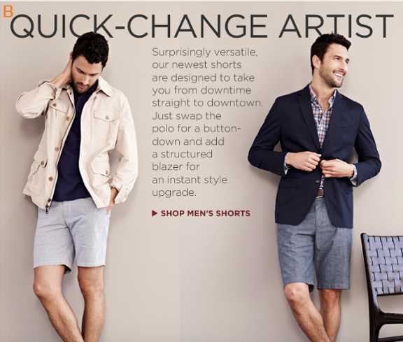 Compare that with Email B from Banana Republic. The goal of this email is to sell shorts, but the copy isn’t just shoving shorts down the recipient’s throat. I mean, they’re shorts … big deal, right? They’ve identified what makes these shorts worthwhile: their versatility. They allow a man to lounge around the house and then go out in the city while putting minimal effort into changing his outfit. How convenient! How easy! How versatile!