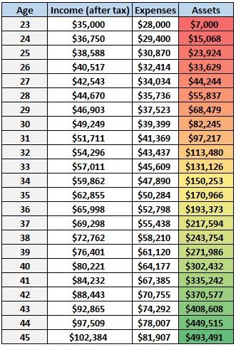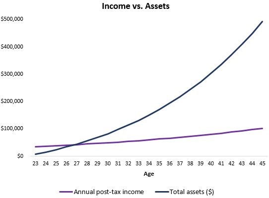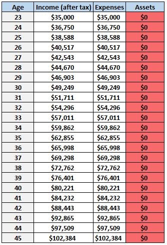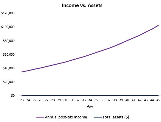 Consider the following example of a 23-year-old who starts their career with a post-tax salary of $35,000 and is able to grow their income by 5% each year, yet spends all of their income each year up through their mid-forties without acquiring any assets: