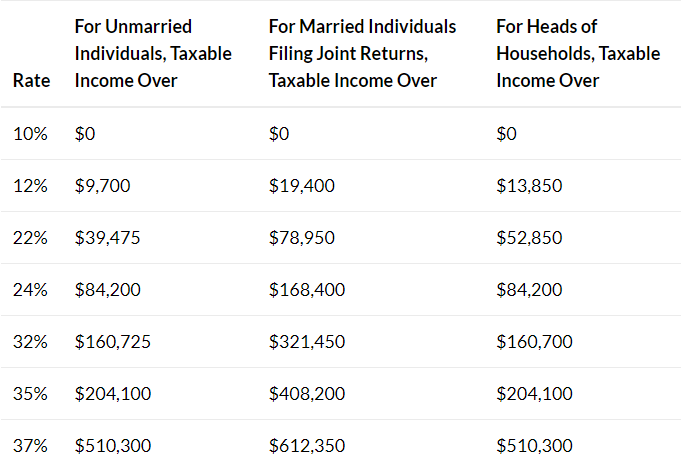 2. Earned income has high tax rates relative to other forms of income. The following table from Tax Foundation shows the tax rates for various income levels as of 2019: